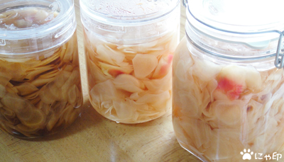 左はてんさい糖使用なのでたぶん茶色いガリに、