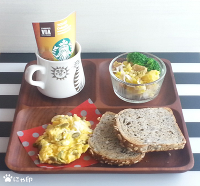 スクランブルエッグのかぼちゃの種の食感がおもしろい(* ̄∀ ̄*)