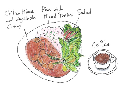 雑穀米の彩り野菜鶏ミンチカレーとコーヒーを注文。